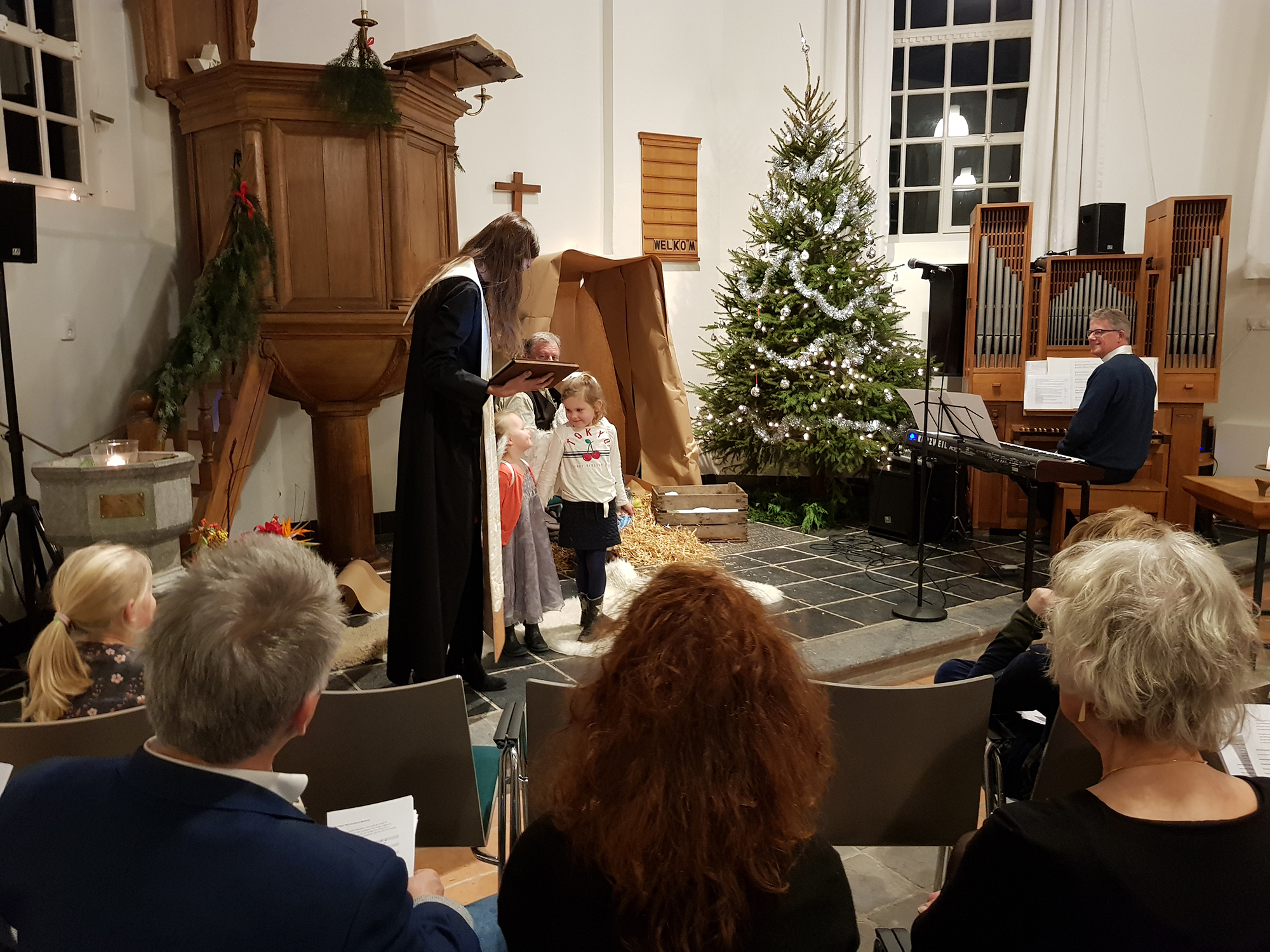 Na het zingen van ‘Midden in de winternacht’, begeleid door organist Chiel Spaans, begon het traditionele kerstspel volgens het evangelie van Lucas door de jeugd. Hierin speelden Maria, verschillende engelen, een schaap en een echte baby als Jezus. De herders ontbraken en ter plaatse werd Jozef benoemd. Het spel door de jeugd werd onderbroken door actuele items. Een brief van een vluchteling uit Syrië werd voorgelezen, een verhaal uit eigen ervaring van een pleegouder en een verhaal van iemand die een geadopteerde broer en zus heeft. Tussendoor zong Anne Marte Kingma enkele mooie liederen met als slot een echte rap. De jongeren van de gemeente hadden vooraf al gesproken over het onderwerp vluchteling en hebben besloten om samen met hen pannenkoeken te gaan bakken en voor hen Arabisch te gaan leren. Na afloop liet iedereen zich de chocolademelk goed smaken.